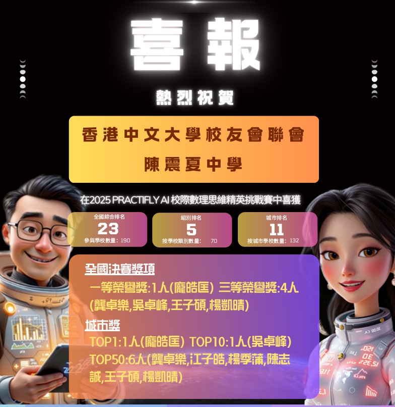 Our school’s students performed excellently in the 2025 PractiflyAI Greater Bay Region Mathematical Competition held in late 2025. Out of 190 participating schools nationwide, our school ranked 23rd; We secured the 11th position among the 132 participating schools in Hong Kong, achieving 5th place in a category with 70 other schools, marking an impressive performance.