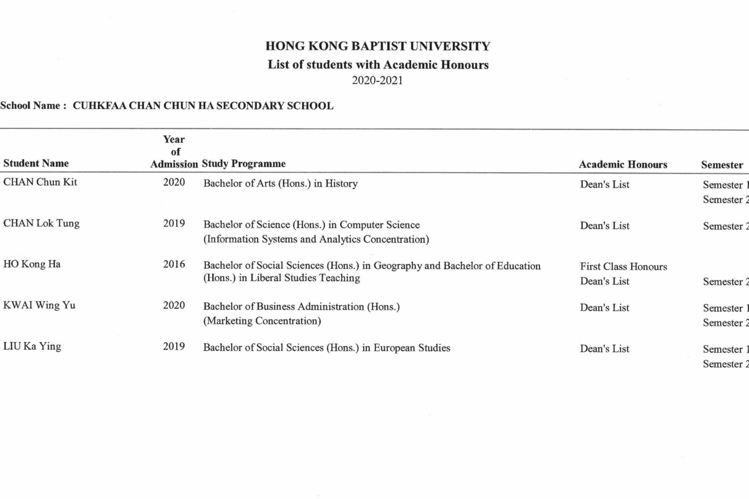 本校校友榮獲香港浸會大學頒發一級榮譽及院長榮譽錄