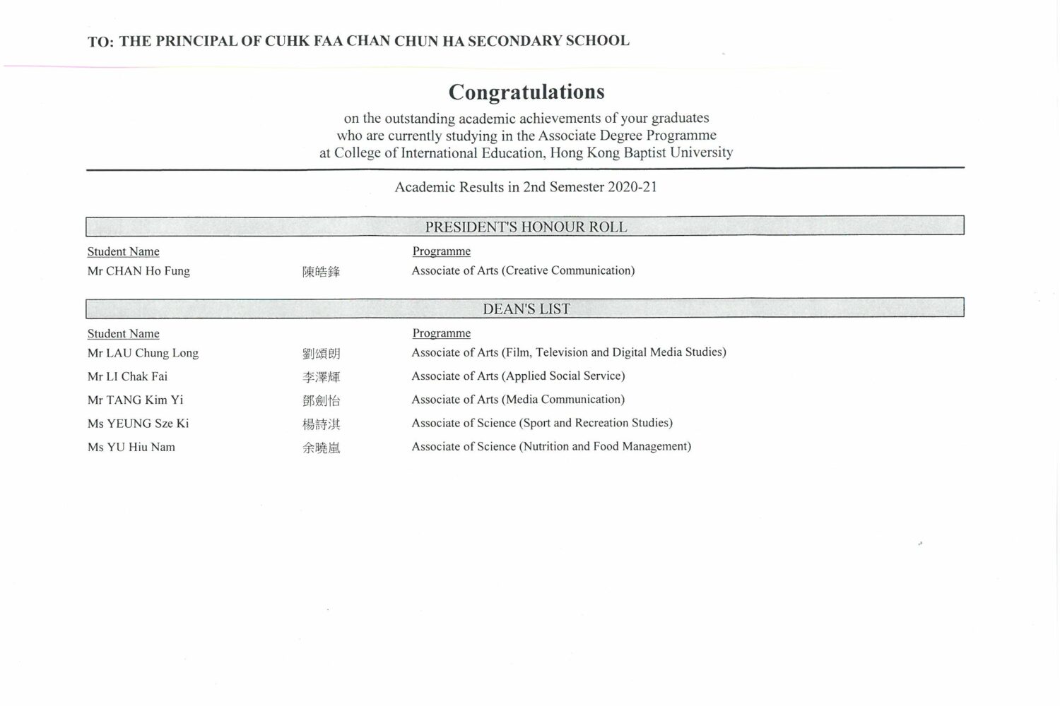 本校校友榮獲香港浸會大學國際學院頒發成績優異獎項