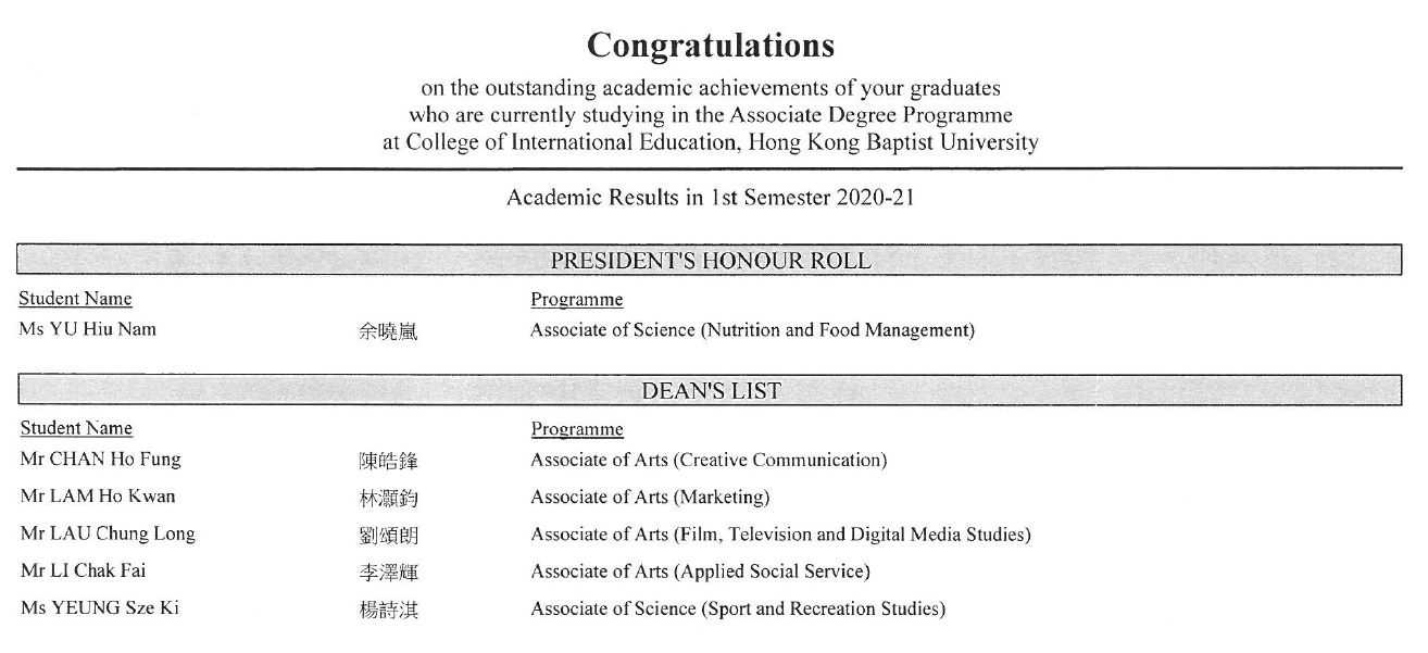 本校校友榮獲香港浸會大學國際學院頒發成績優異獎項
