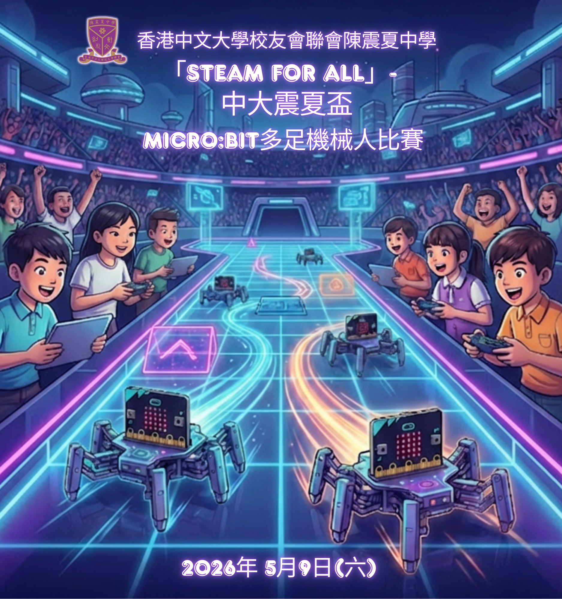 本校致力推動電子學習及STEAM教育,把初中科技學科融入STEAM教育元素,培養學生的創造、協作和解決問題的能力。為提高學生學習STEAM的興趣及讓小學師生及家長認識本校的STEAM教育,本校將於2026年5月9日(星期六)舉辦「STEAM for All」— 中大震夏盃 micro:bit 多足機械人比賽,有關詳情如下: